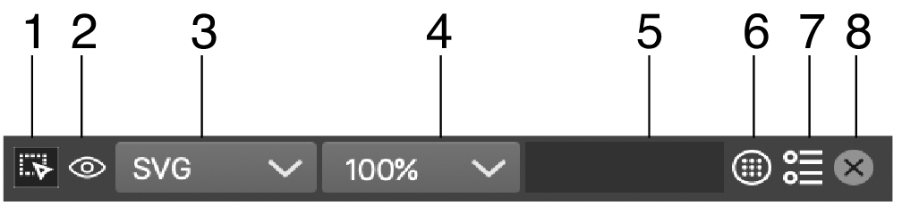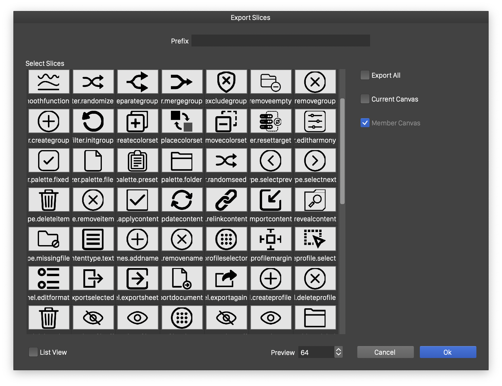 - Export Canvas Slices - Opens the Export Slices modal view listing the slices of the current canvas for selection and exporting.