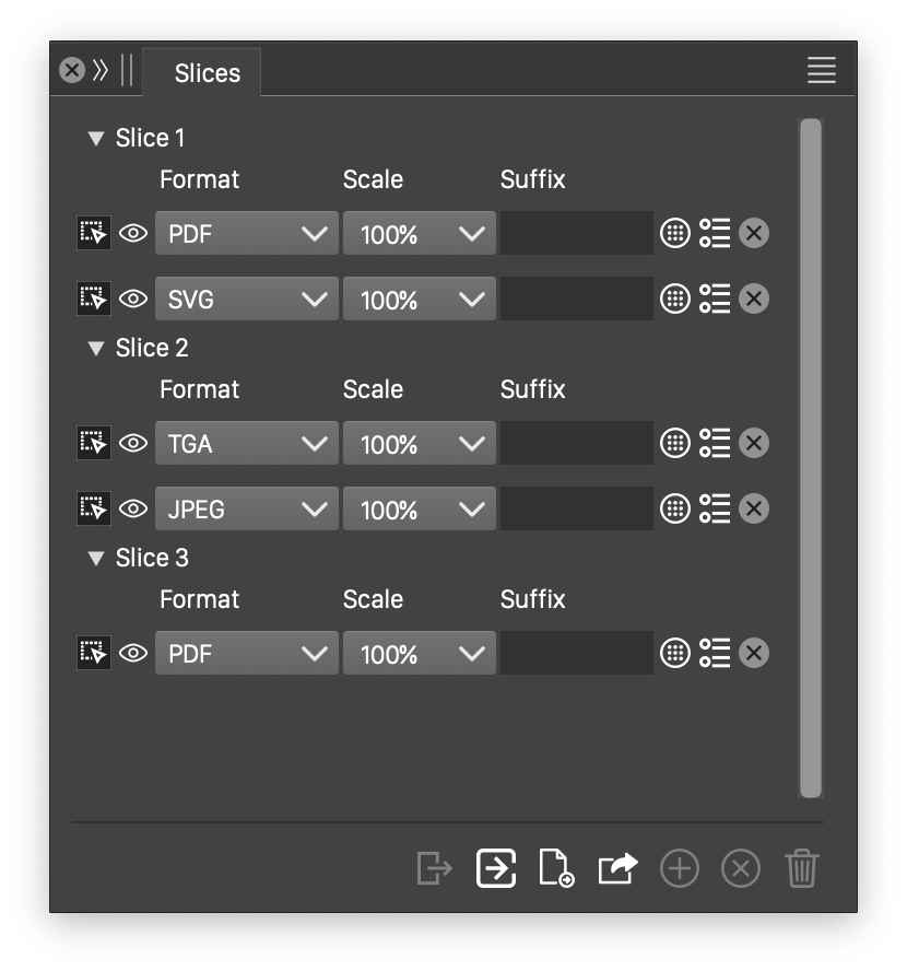 Each slice contains a set of export format settings, exporting the region delimited by the slices with these file formats. An export format may also be an export profile style, selecting a collection of file formats in a single step.