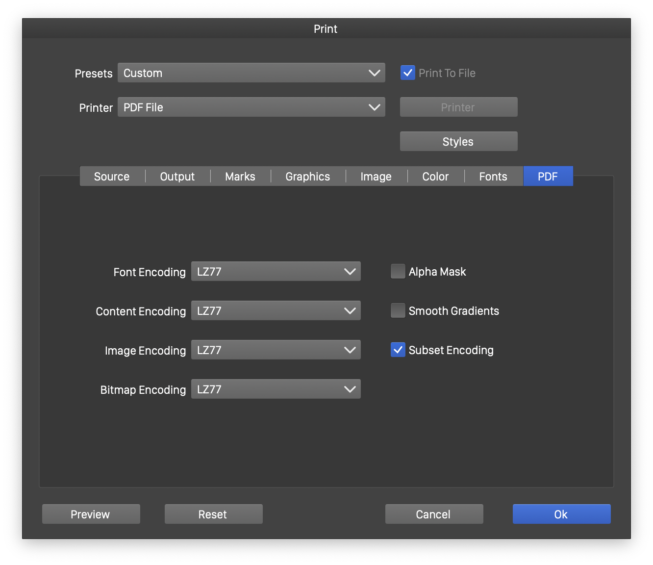 - Subset Encoding - Enable or disable the reduction of embedded font encodings.