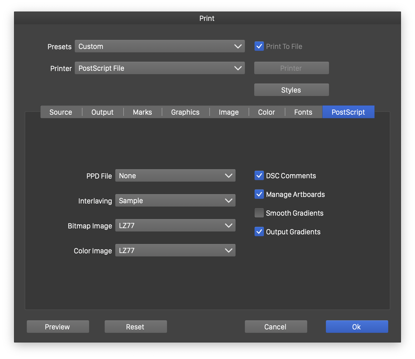 - Output Gradients - Enable or disable the use of gradient rendering features of the Postscript language.