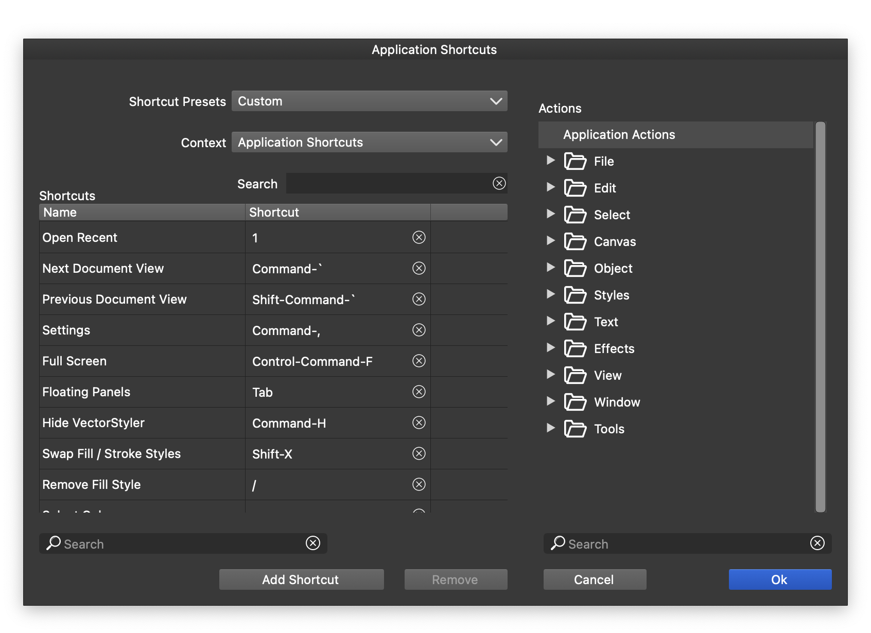 - Add Shortcut - Adds the selected command or action (from the right side), to the list of shortcuts of the current context.