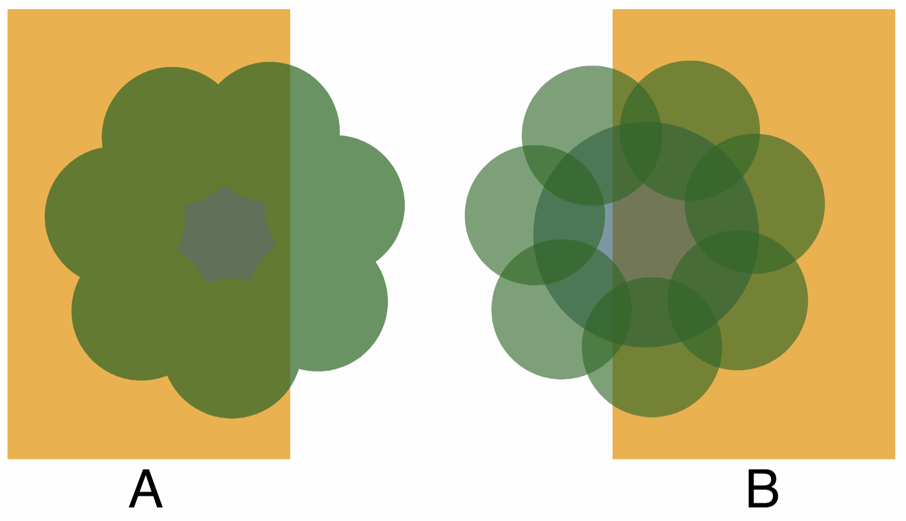 A group of objects with opacity: (A) the group has a common opacity, (B) each object has its own opacity value.