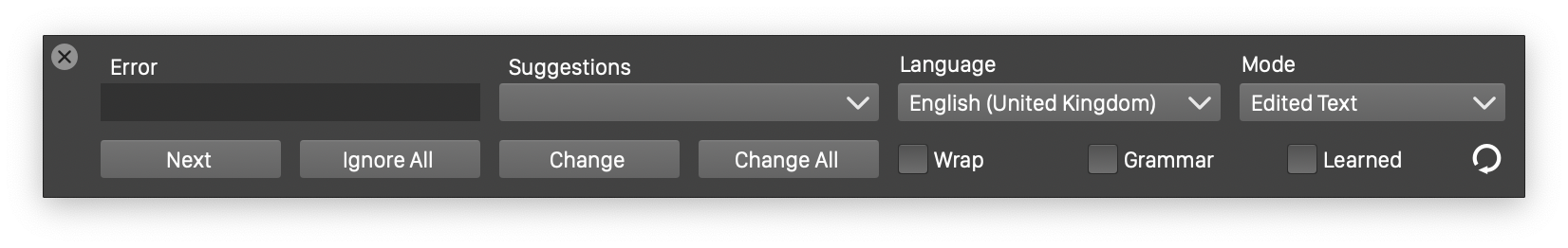 The spelling and grammar of the text shapes and text flows, can be verified using the Spell Checker panel. The Spell Checker can be opened from the Edit or the Text menus. The spell checker uses the spelling and grammar engine and dictionaries installed in the host operating system.