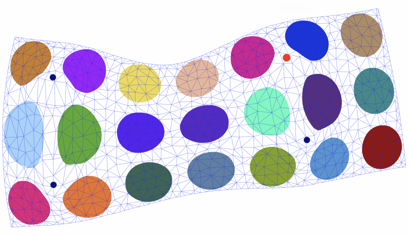In the elastic warp effect (described in the Mesh Effects section), pin point locations of an object or group are moved, and the shapes are distorted according to an elastic stretching of the object geometry.