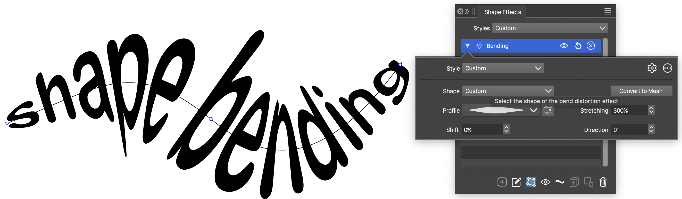 button from the Shape Effects panel. The bending shape is edited in a similar way as an object shape.