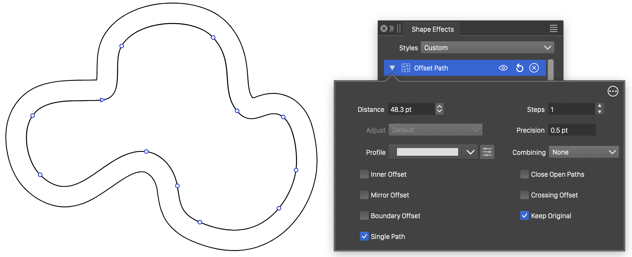 In the Offset Path effect (described in the Outline Effects section), an object shape is expanded or reduced using a shape offset distance.