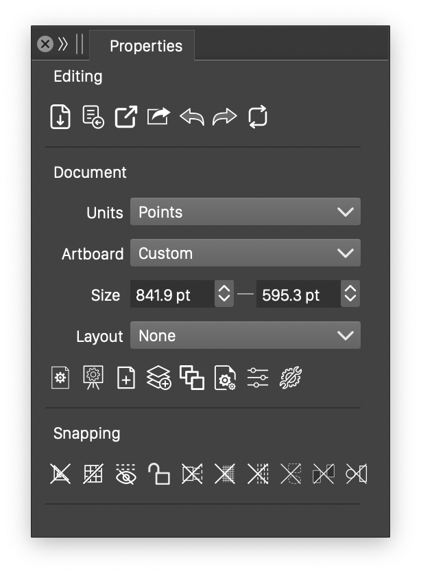 - The Document section is visible in case of no selection, and contains a set of document, canvas and artboard options.