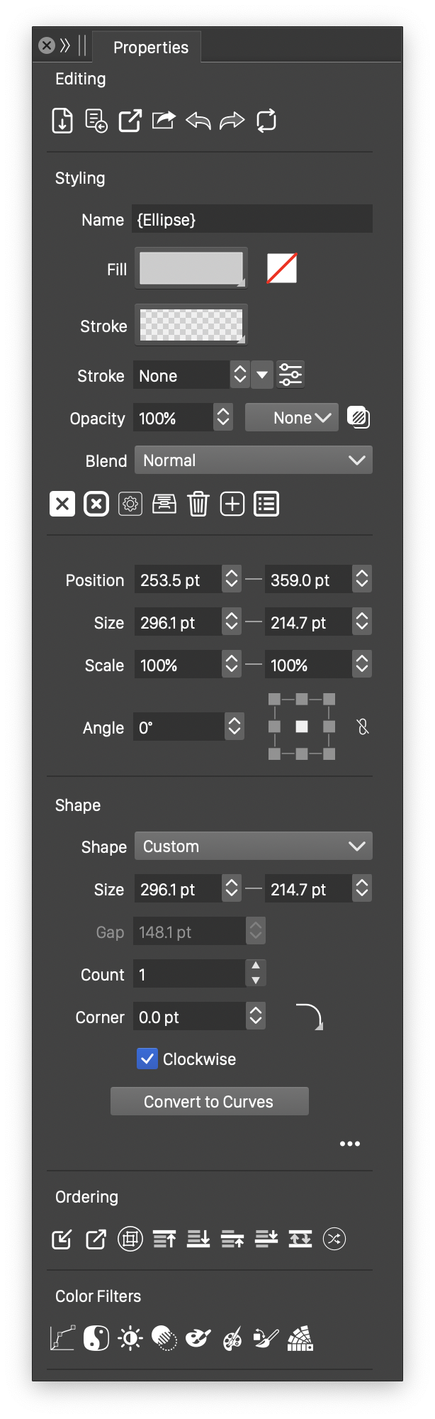 - The Color Filters section, shown for one or more selected objects, contains common color filters suitable for artwork recoloring.