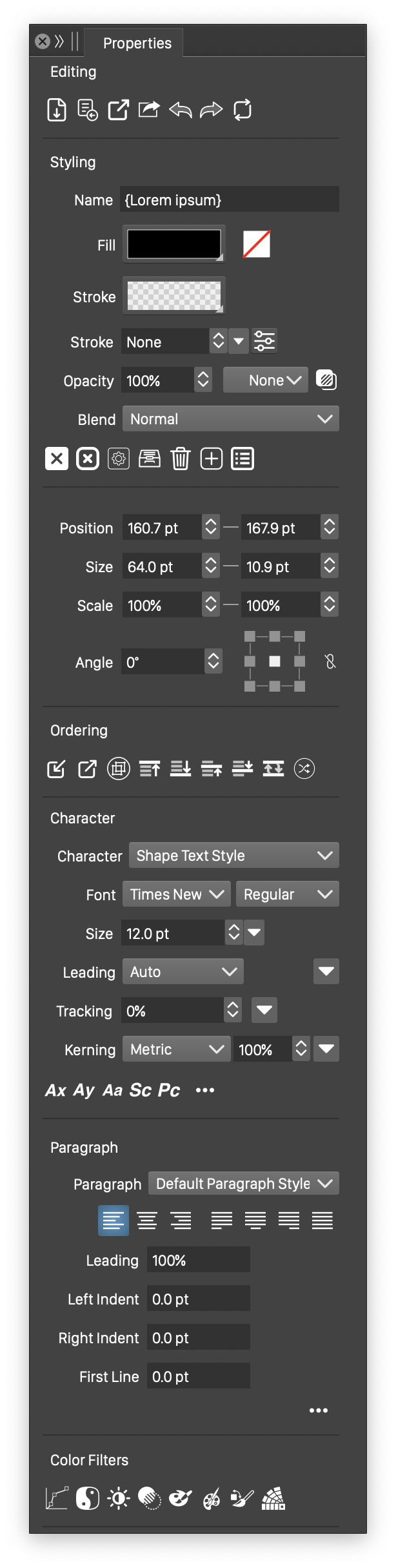 The properties panel consists of sections that are shown for various editing scenarios and selections. The following common editing sections are provided: