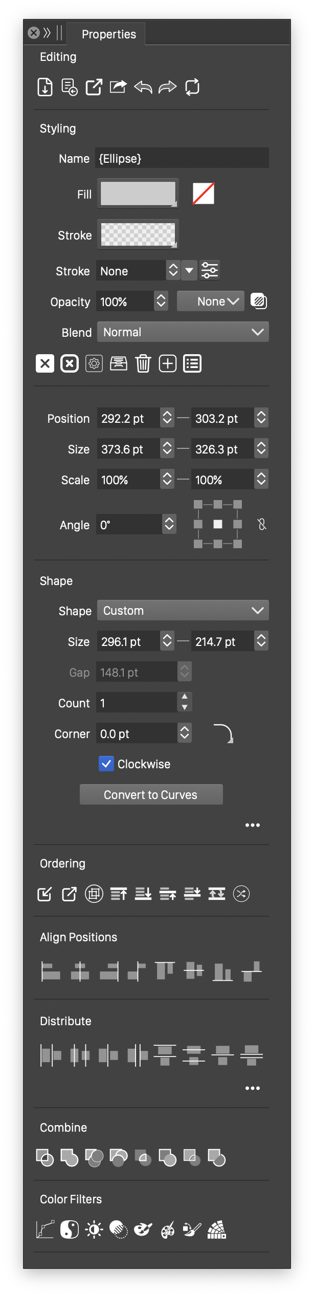 - The Styling section shown when one or more objects are selected. The styling section contains styling attributes of the selected objects, including, object naming, fill and outline styling, stroke width and attributes, opacity and transparency mask selections, and a group of object attribute editing buttons.