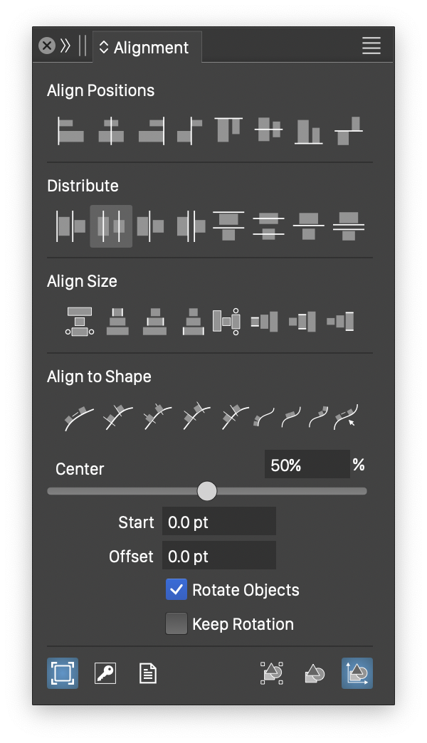 By default, the panels are in vertical mode, and can be docked only on the left or the right side of the application windows. In VectorStyler, some panels (depending on the panel content) allow a horizontal mode, when the panel can be docked at the top or bottom of the application window.