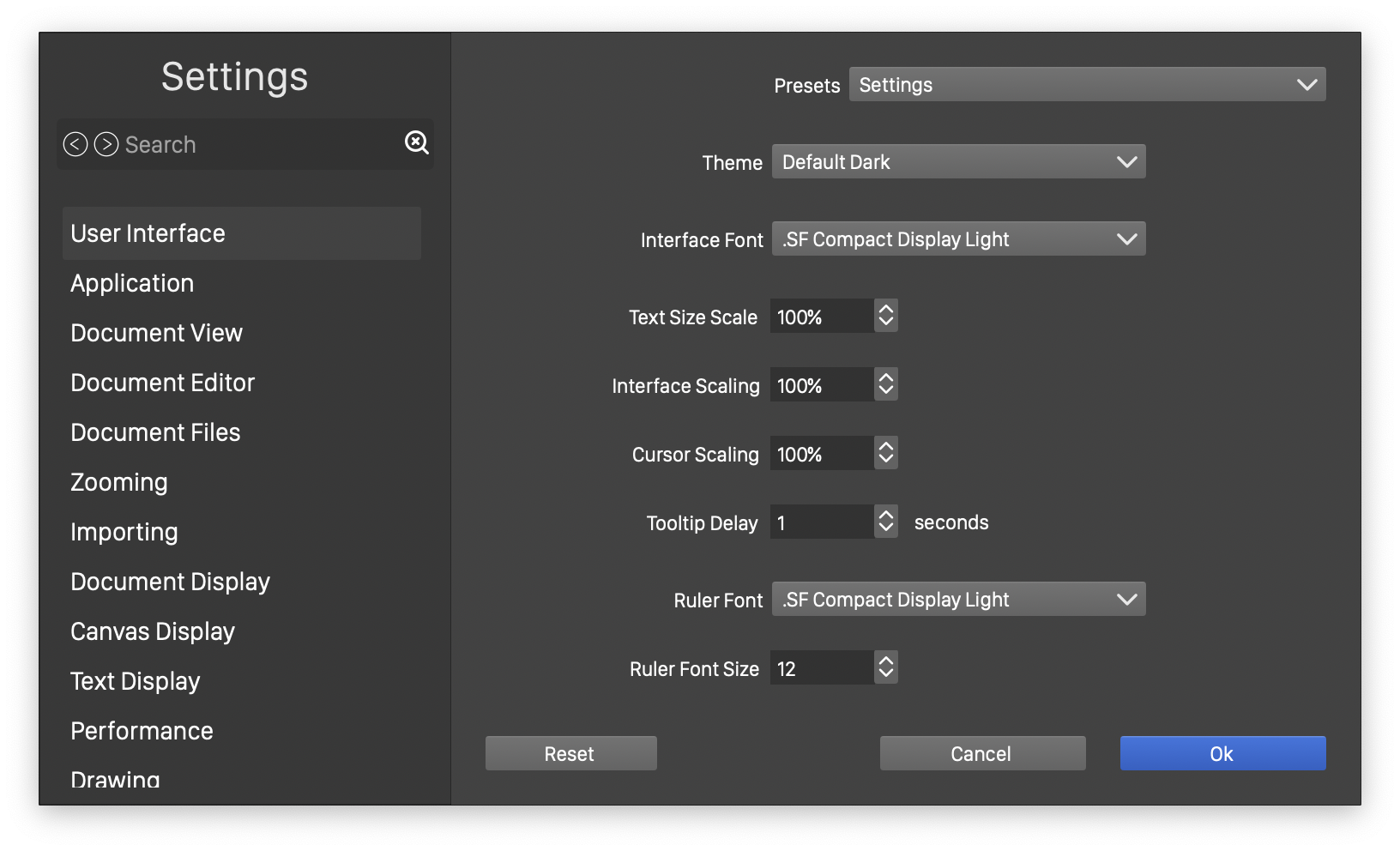 The customization options of VectorStyler are grouped into two domains: Settings and the Workspace. The Settings consists of all the direct settings and options accessible from the Settings command of the application menu (Edit menu on Windows). The various application settings can be adjusted according to the specific workflow and user requirements.