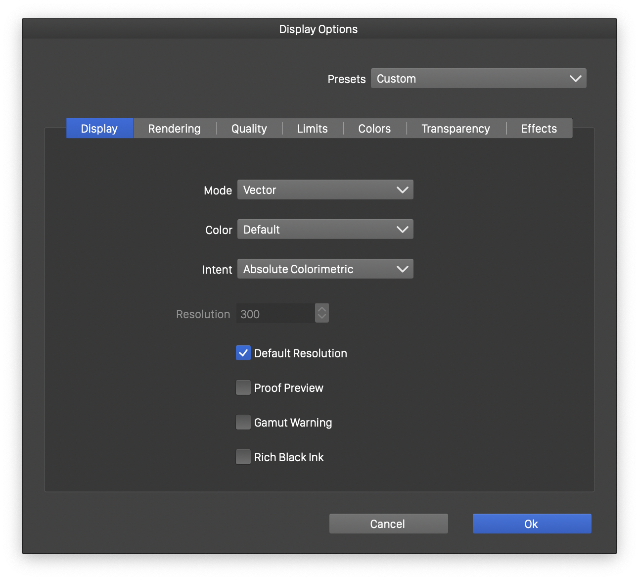 - Allow Effects - Enable or disable the rendering of image effects when displaying the document on screen.