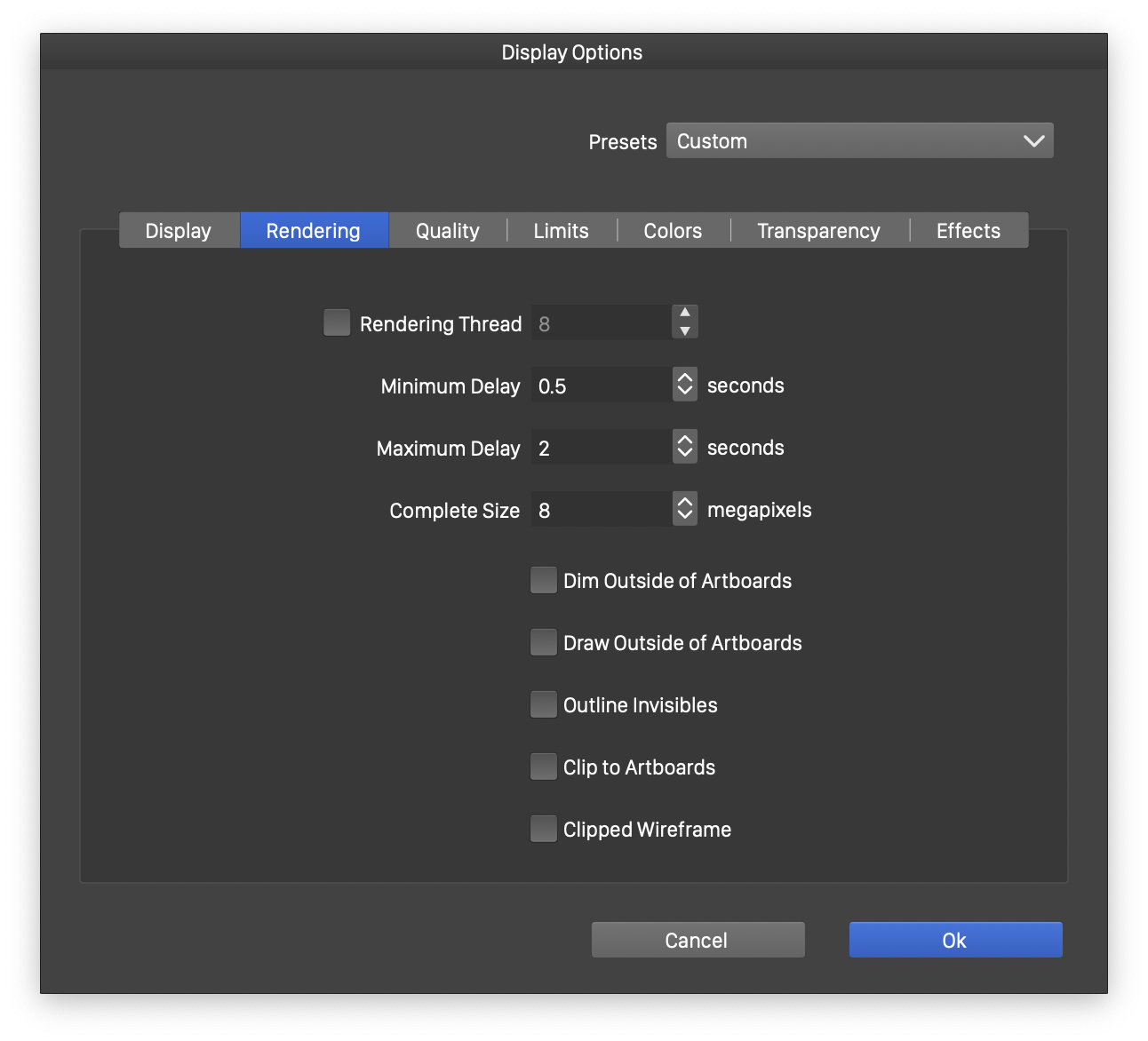 - Cached Complexity - Select the complexity level of effects for which object or layer images fill be cached. Caching object and layer images for complex effects may improve rendering performance while interacting with the document.