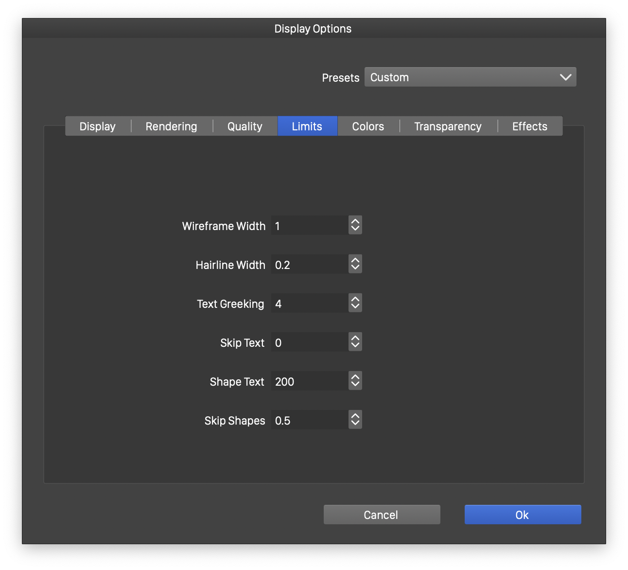 - Text Greeking - Select the limit used to render text as gray boxes (also known as greek text). This limit is set in pixels.