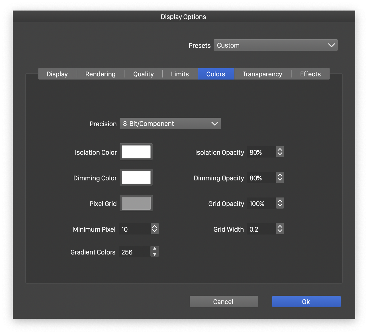 - Pixel Grid - Select the color used to render the margin of pixels in pixel preview mode (at sufficiently large zooms).