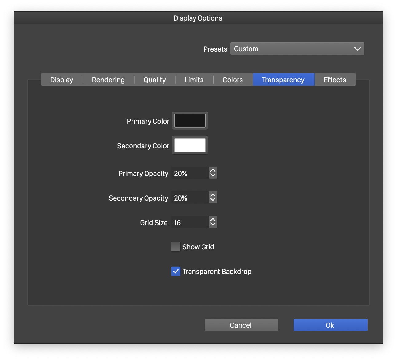 - Transparency section contains color and opacity settings used to render the transparency grid. The transparency grid is rendered using two colors, the primary and the secondary.