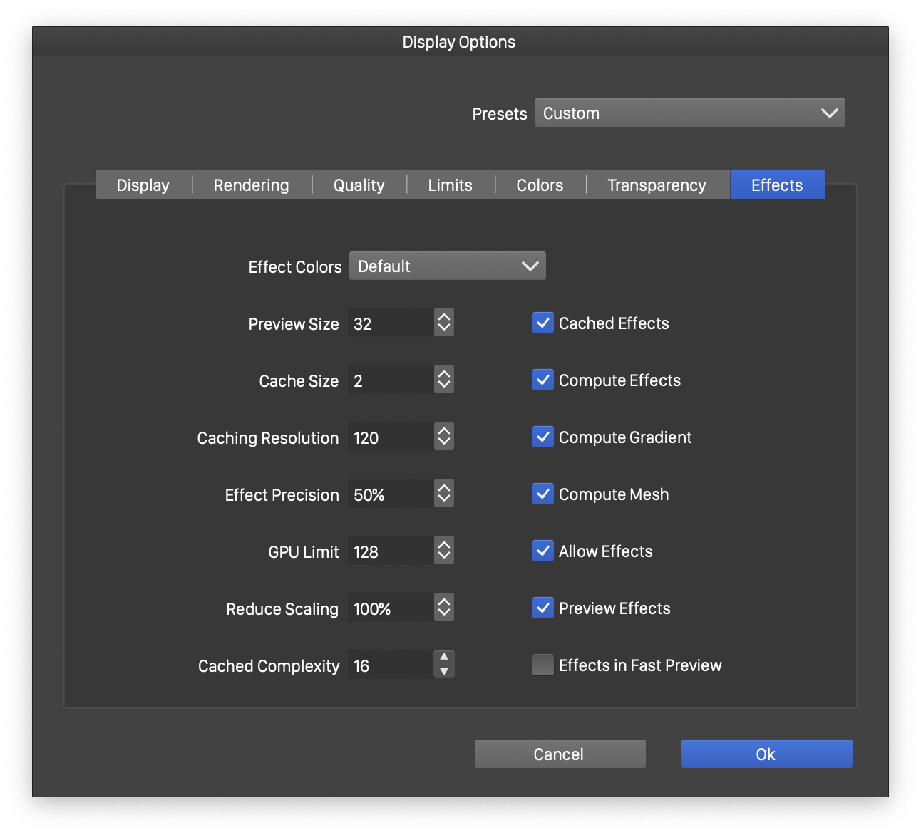 - Effect Precision - Select the precision used when applying effects to large images while displaying on screen. Some image effects can be slow to render at full resolution. When rendering on screen while editing, the precision of these effects may not be as important as the performance of refreshing the screen. Set this value to 100% for full on screen precision, and 10% for the lowest precision.