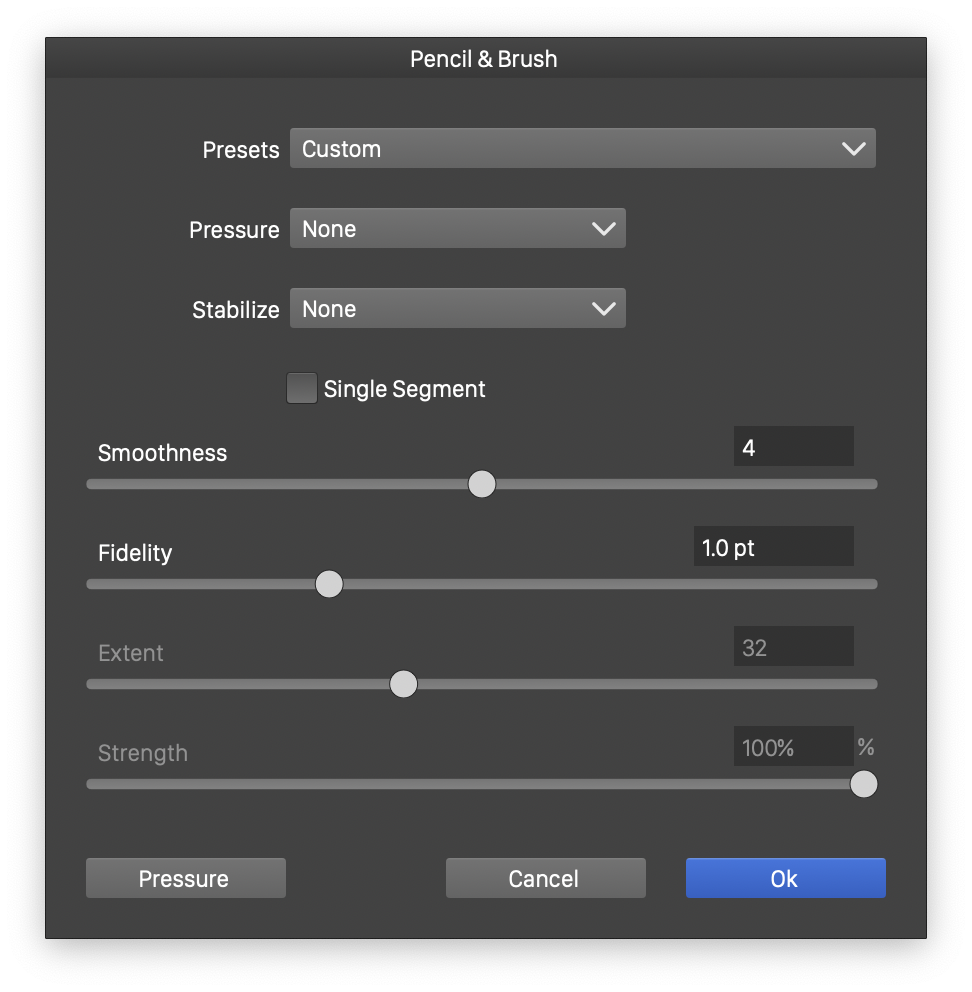 To translate tablet pencil pressure, or mouse velocity to variable width profiles, select a Pressure mode in the context panel. The pressure options are: