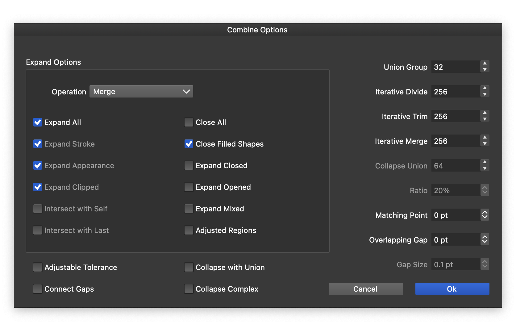 The shape combine operations use several options to control how strokes or open shapes are handled, and how to deal with complex appearance of objects.