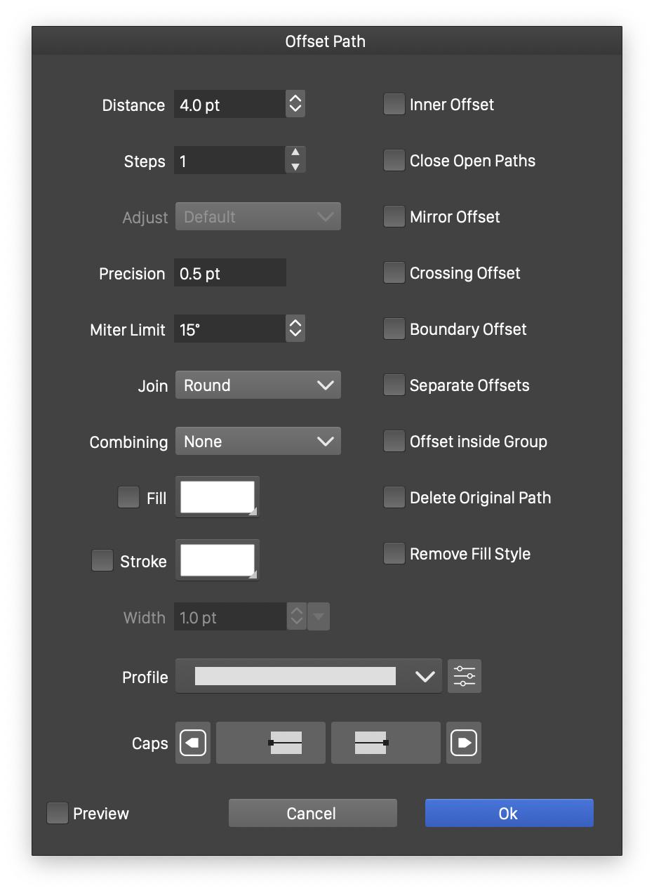 The Offset Path command from the Objects - Shape menu, can be used to create new objects by offsetting the shape of the selected object. The following options are available.