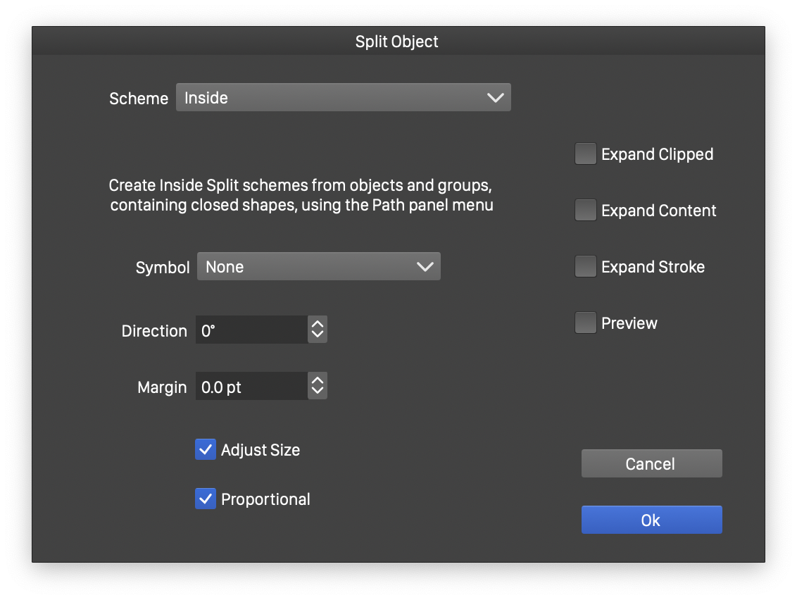 The Inside splitting scheme can be used to split the objects into a set of regions delimited by closed shape. The closed shapes can be selected from a symbol, or can created using the Create Inside Split Scheme command of the Path panel menu.