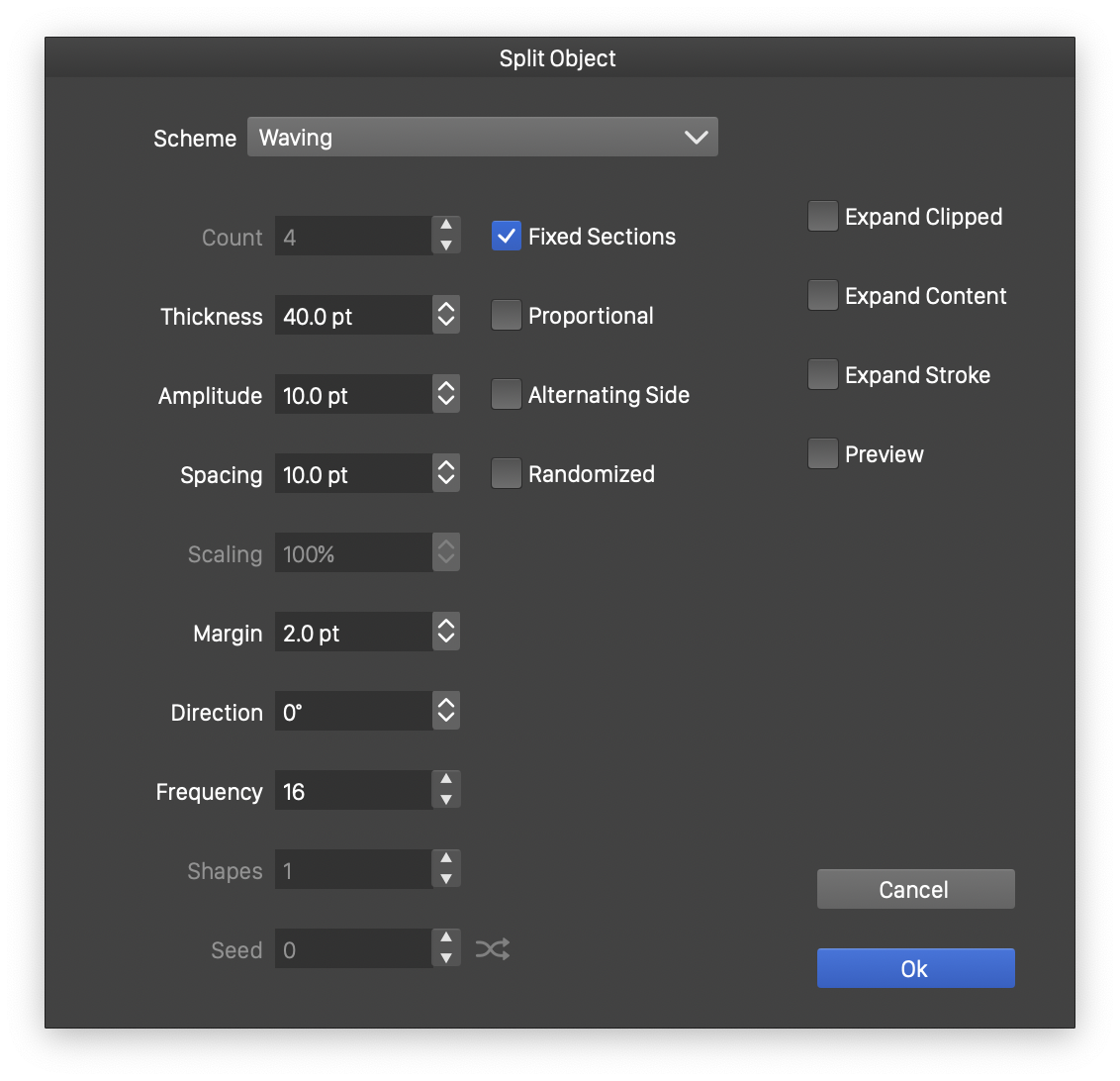 The Waving and Zig Zag splitting schemes can be used to split the objects into a set of sections delimited by a waving or a zig zag shape.