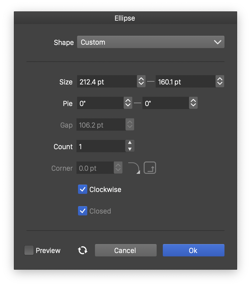 - Clockwise - Set the ellipse shape direction to clockwise or counter-clockwise. The shape direction can be observed with the Node tool, after converting the ellipse to curves.