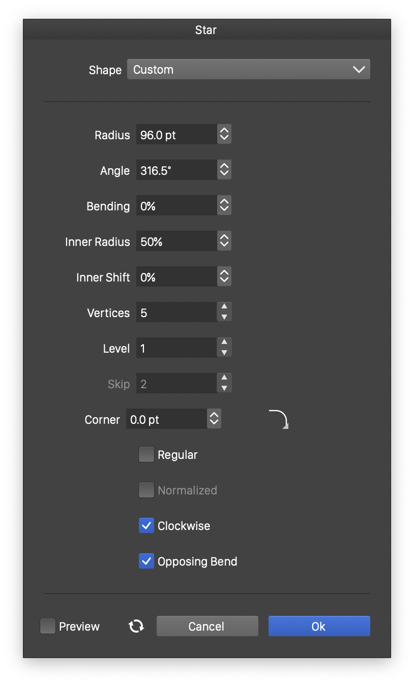 - Normalized - Enable or disable the normalization of a regular star shape. Normalization means cleaning up the self intersecting segments so that the winding and even-odd filling modes produce the same result.