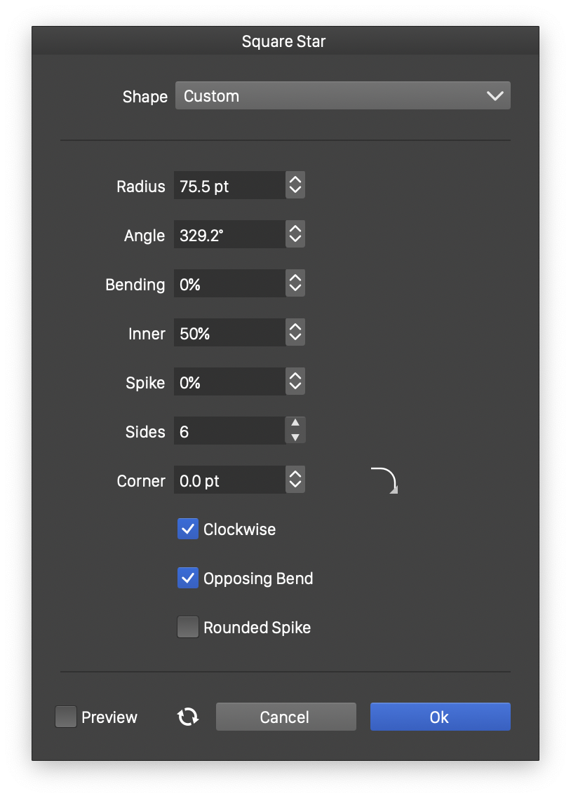 - Clockwise - Set the polygon shape direction to clockwise or counter-clockwise. The shape direction can be observed with the Node tool after converting the square star to curves.