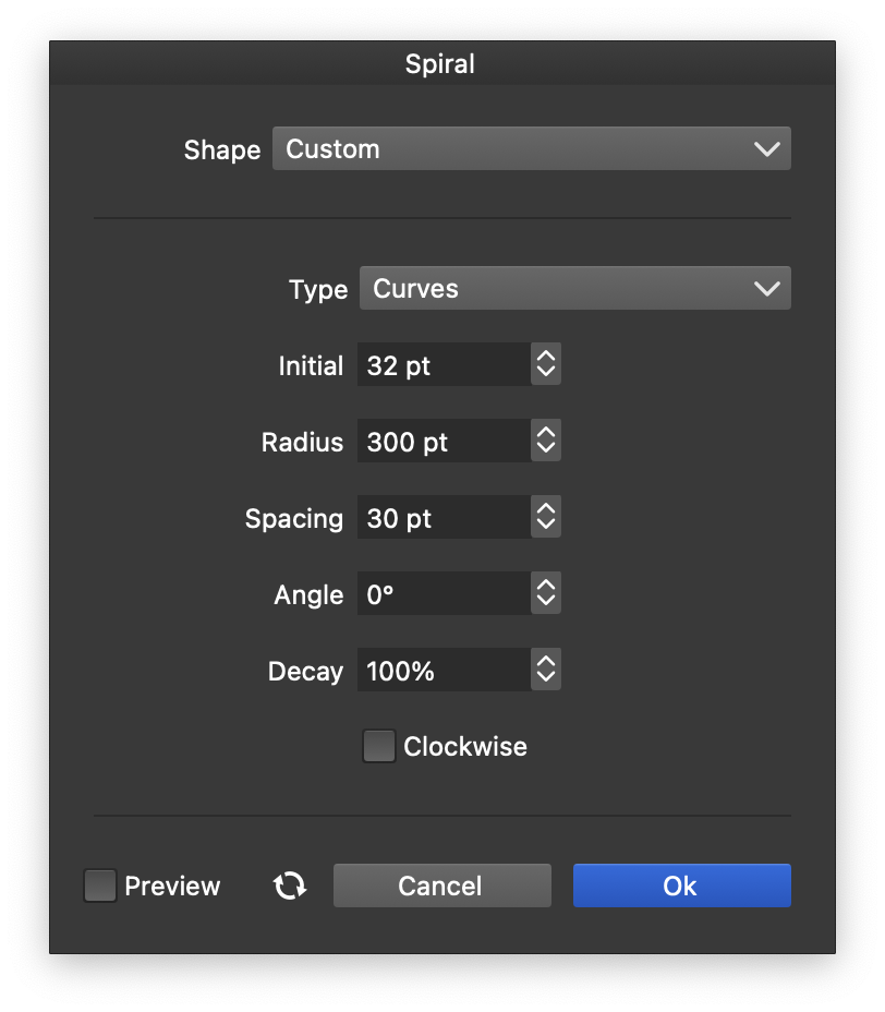 - Clockwise - Set the spiral shape direction to clockwise or counter-clockwise. The shape direction can be observed with the Node tool after converting the spiral to curves.