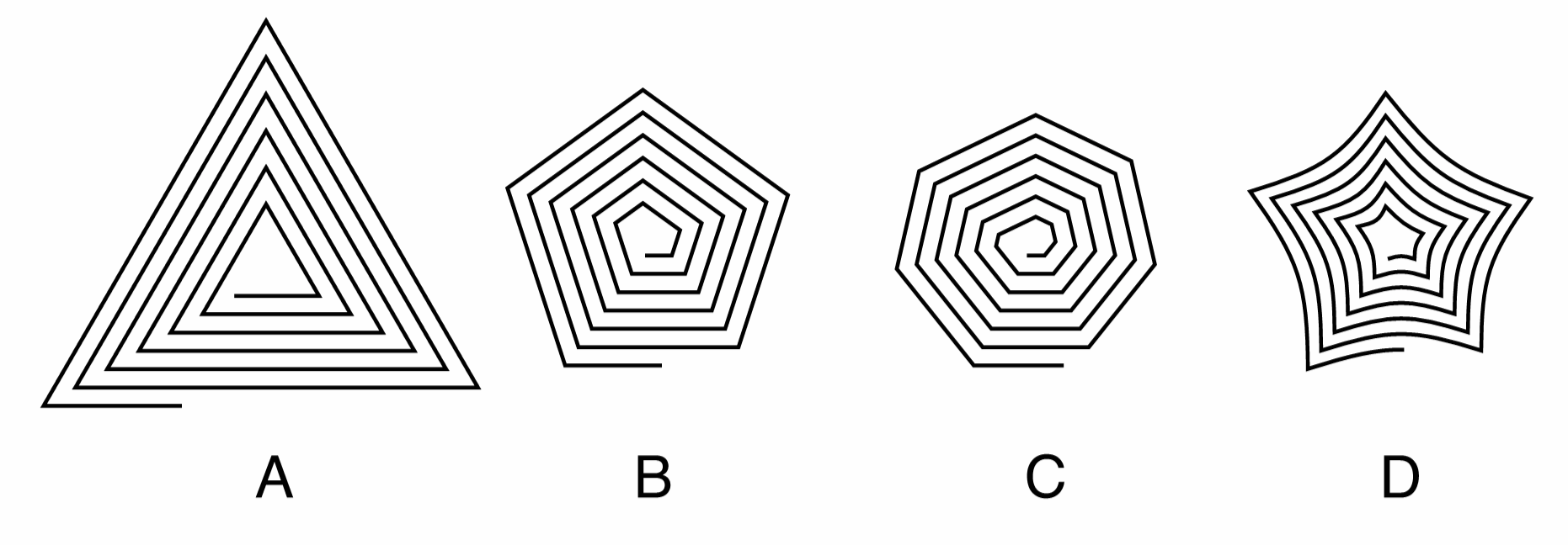 Polygonal spirals with different properties: (A) a polygonal spiral with 3 sides, (B) a polygonal spiral with 5 sides, (C) a polygonal spiral with 7 sides, (D) a polygonal spiral with 5 sides and bending of the sides.
