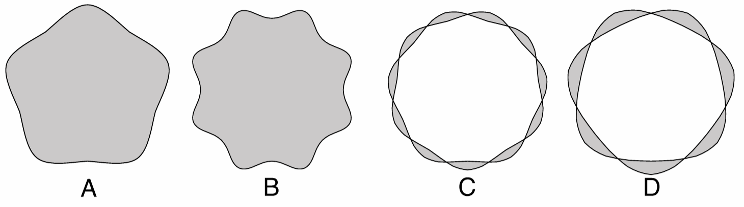 Super shapes with different properties: (A) a 5 sided super shape, (B) an 8 sided super shape, (C) a super shape with 5.5 sides, (D) a super shape with 3.5 sides.