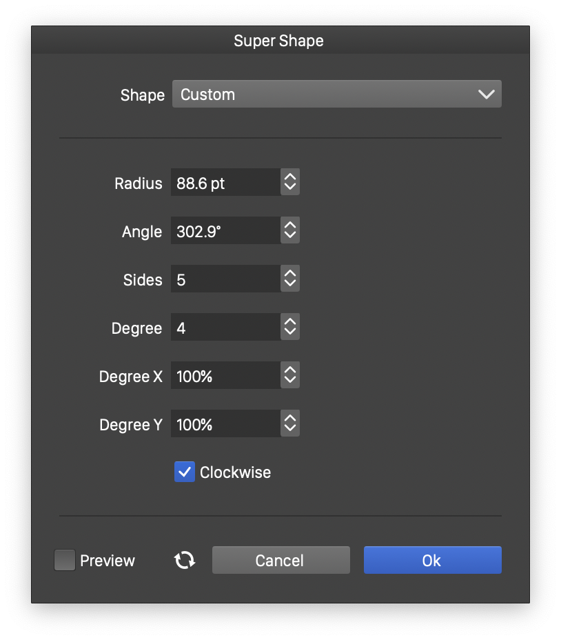 - Clockwise - Set the super shape direction to clockwise or counter-clockwise. The shape direction can be observed with the Node tool after converting the super shape to curves.