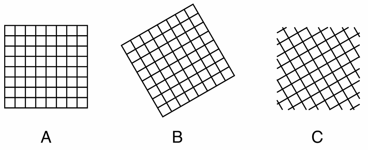 Grids with different properties: (A) a normal grid, (B) a rotated grid with frame, (C) a rotated clipped grid with no frame.