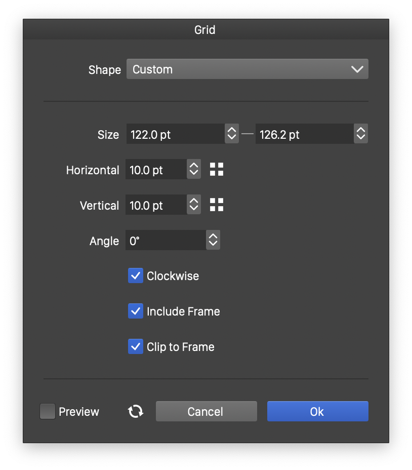 To create a grid by setting the numeric properties of the shape, click at a point on the canvas. This will open the Grid view (described below) that contains all the grid shape properties. Set the required values and press Ok to create a new object with a grid shape.