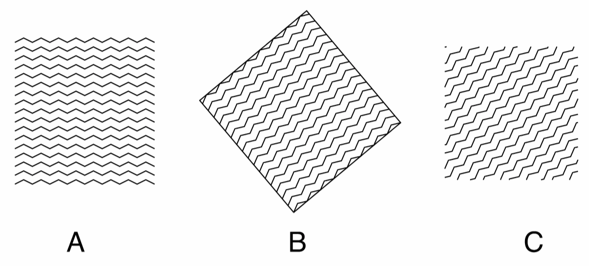 Zigzag grid shapes with different properties: (A) a normal zigzag grid, (B) a rotated zigzag grid with frame, (C) a clipped zigzag grid with no frame.