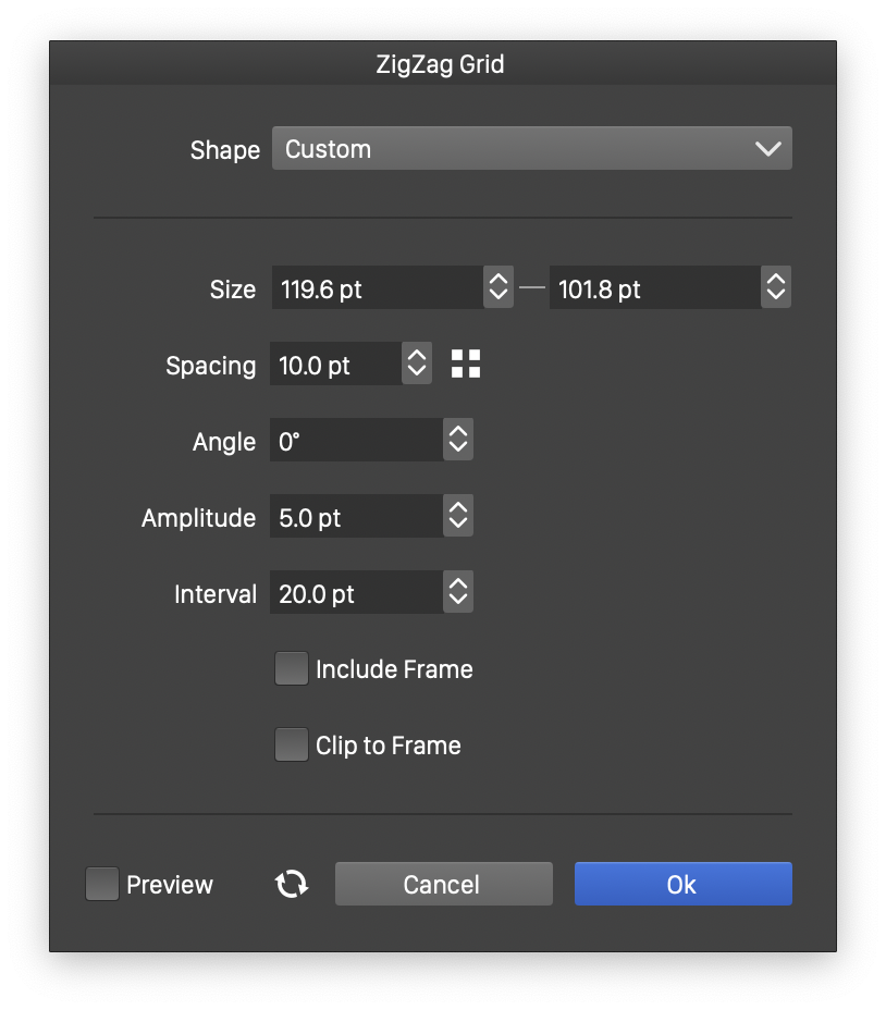 To create a zigzag grid by setting the numeric properties of the shape, click at a point on the canvas. This will open the Zigzag Grid view (described below) that contains all the zigzag grid shape properties. Set the required values and press Ok to create a new object with a zigzag grid shape.