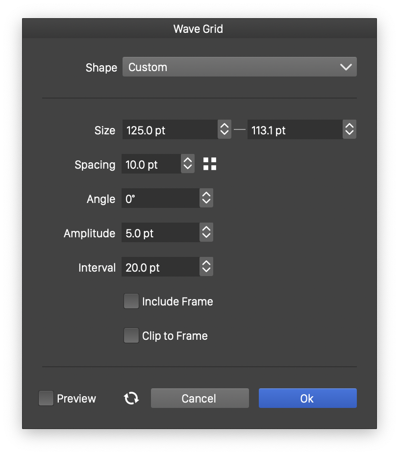 To create a wave grid by setting the numeric properties of the shape, click at a point on the canvas. This will open the Wave Grid view (described below) that contains all the wave grid shape properties. Set the required values and press Ok to create a new object with a wave grid shape.