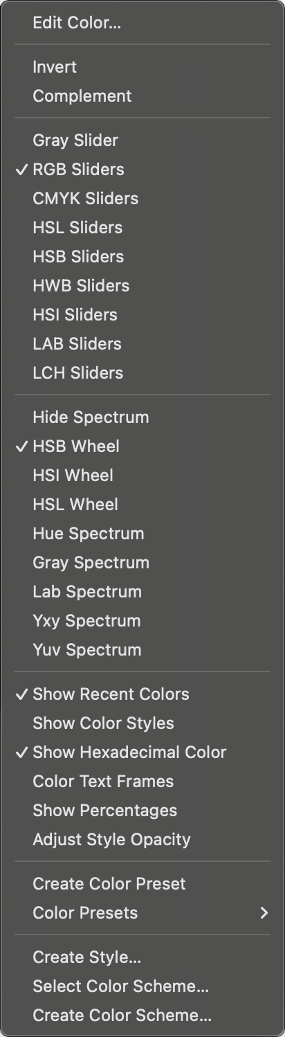 - The various commands suffixed with Wheel or Spectrum (like HSB Wheel or Hue Spectrum) pick an alternative visual color selection modes for the color panel.
