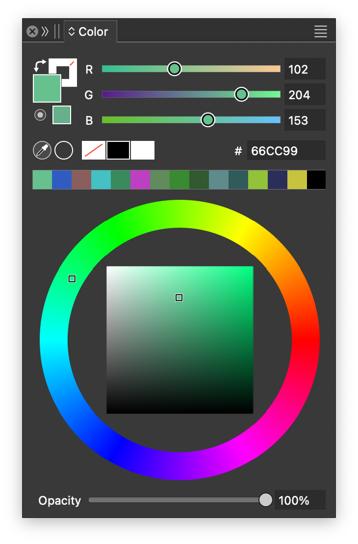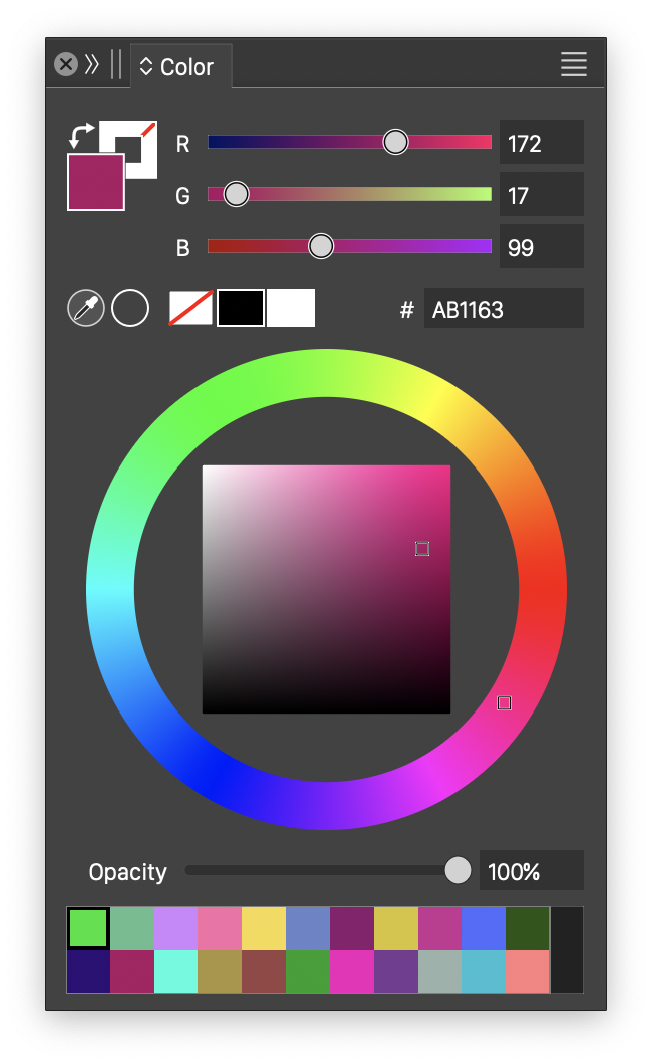 The Color panel can be opened from the Window menu or by pressing Option+C (Mac) or Alt+C (Windows). The color panel is used to select colors for the fill and outline of the selected object. When using the gradient or the mesh gradient editors, the color panel can be used to set the color of the selected color stop or mesh node.