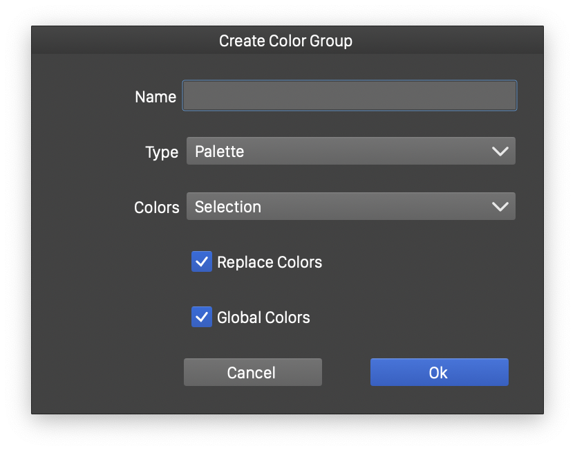 When creating a color group in a palette, the name and type of the group must be set in the Color Group view.