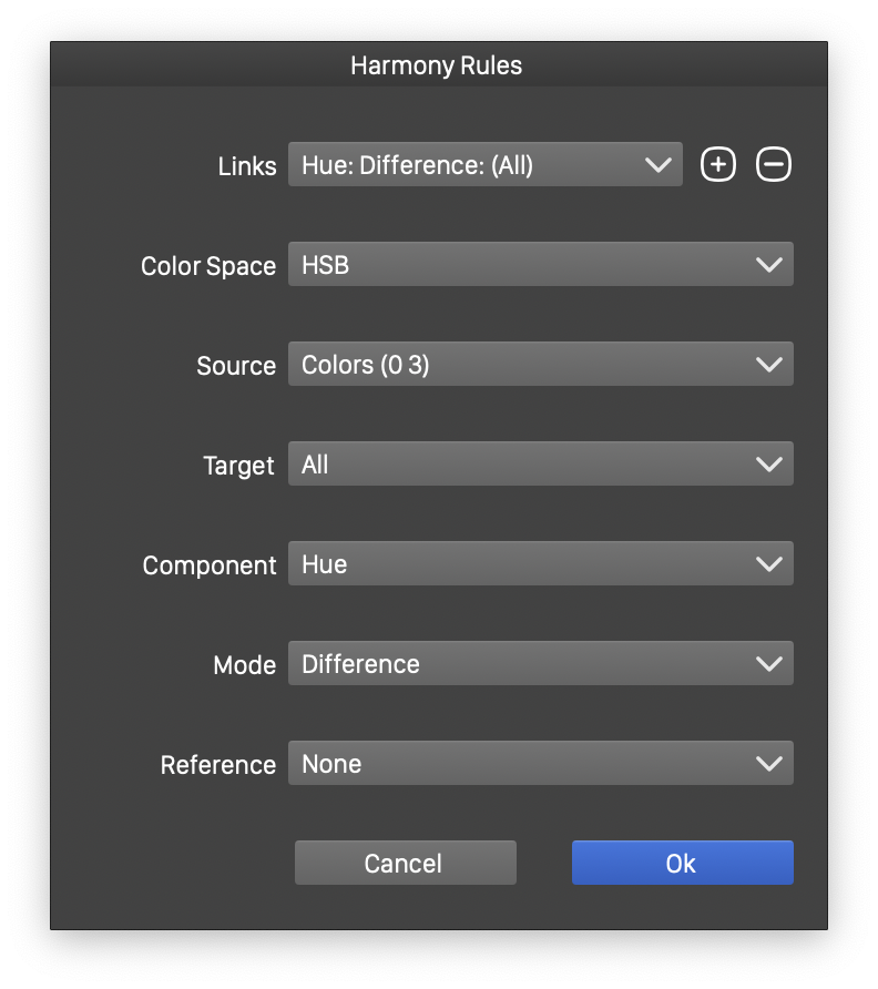 - Links - Opens a list of the existing color component links in the color harmony. These are the rules considered when a color is modified. A new link can be created by pressing the
