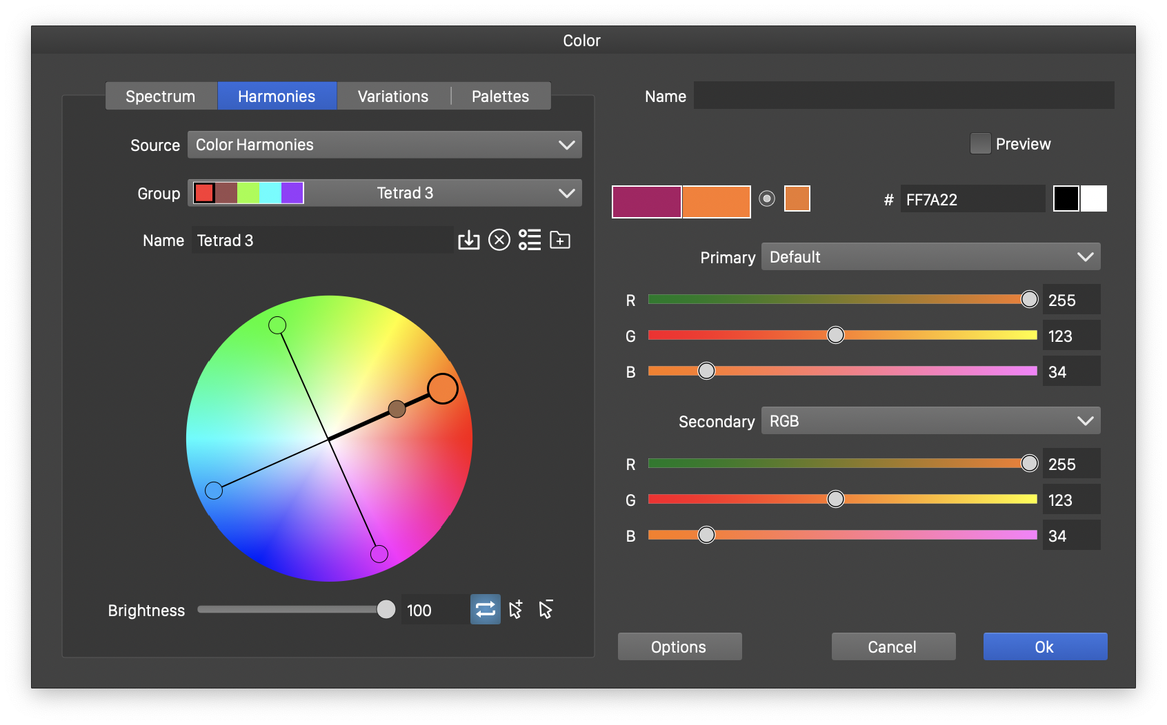- Create a new color harmony preset folder, that can be used to setup and store new color harmony schemes.- Brightness - Adjust the extra color component in the selected color group. The name of this field depends on the color mode used in generating the color harmonies.