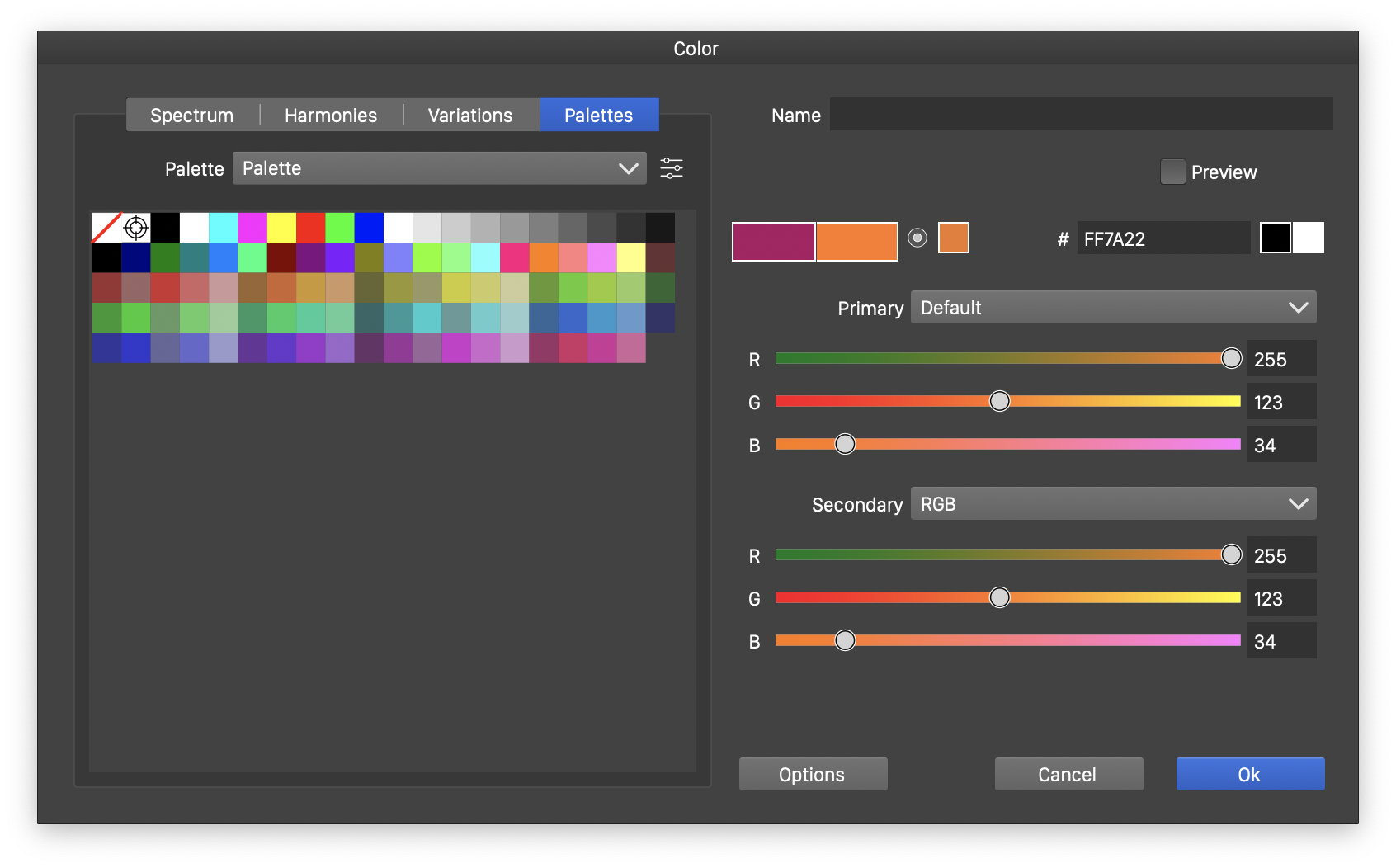 - Name - Edit the color name. The color name is important to set when the color is stored in a palette. When copy / pasting palette colors between documents, the color name is used to remap colors of one document palette to another.