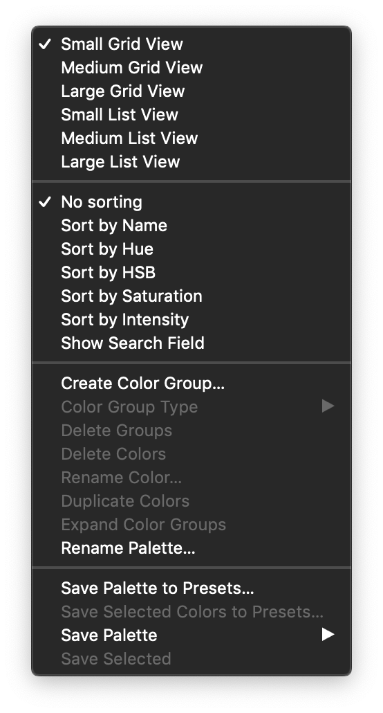 - Grid View and List View - Select the palette viewing mode with various sizes. When shown in a grid view, only the colors of the palette are visible. In the list view mode both the color and the name of the color are visible.