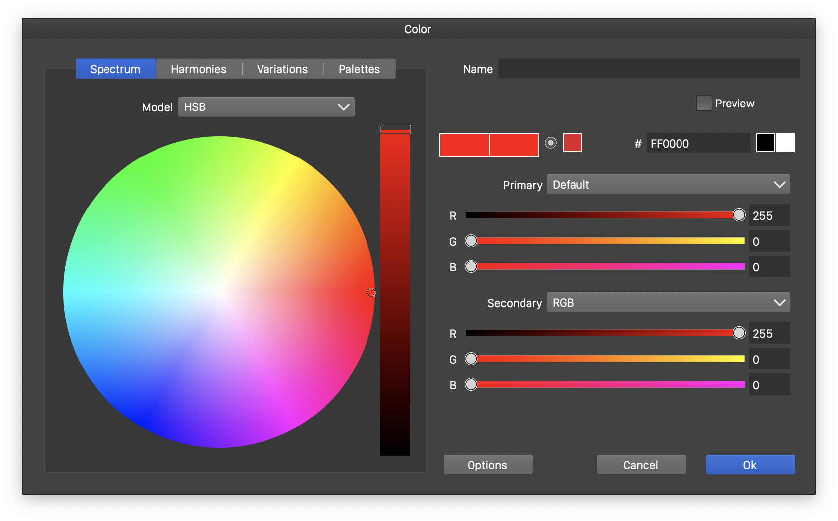 The color spectrum view is used to select colors visually from the spectrum of a color mode. The color mode used for the visual selection is picked from the Model field. Depending on the selected color mode, an additional list is shown next to the Model field, allowing more control over how a color spectrum is displayed.