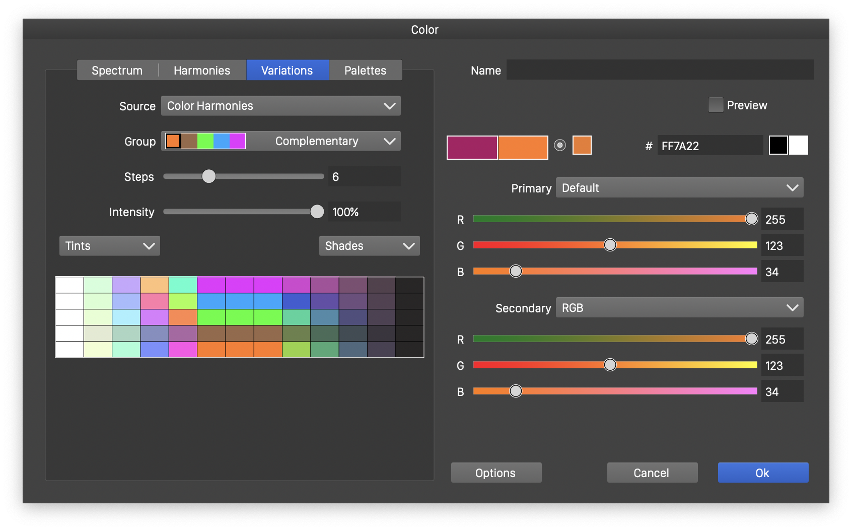 The color variation view (of the color selector view) is used to select variations of a color generated using a color harmony. The color variations are generated into a color grid.