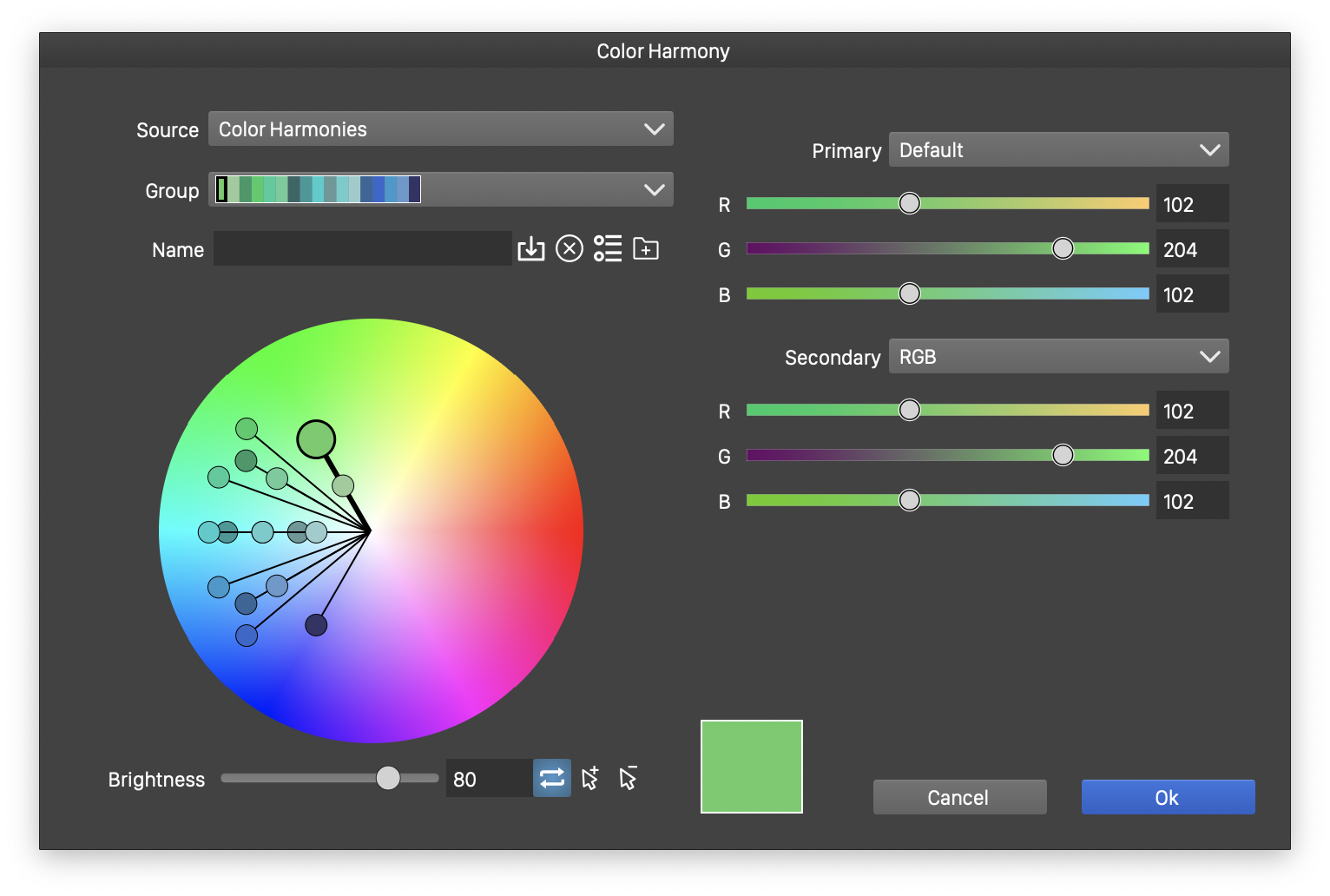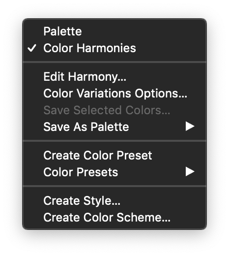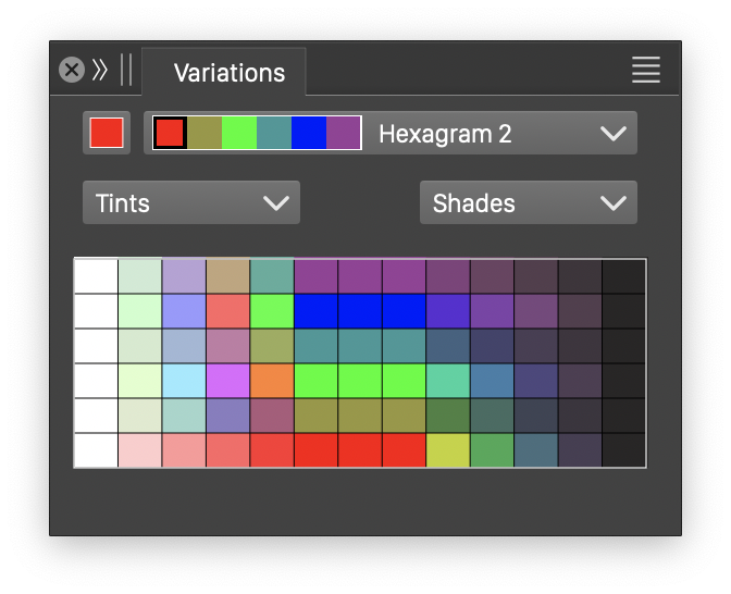 - Palette - Show the color groups of the document palette (this may be empty). These color groups do contain harmony rules, but can be used to generate the color variations grid.