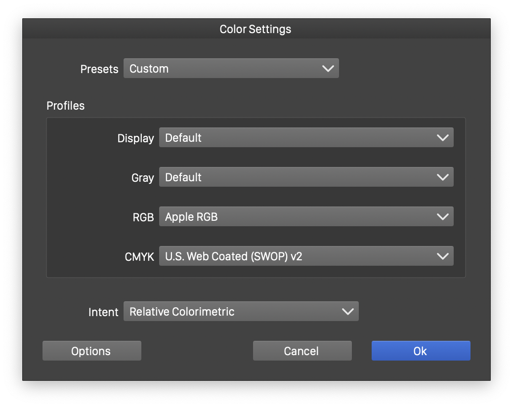 The application level color settings control how colors are displayed on the screen and what are the default conversion schemes between RGB and CMYK color modes. The application color settings can be accessed with the Color Settings command of the Style menu.